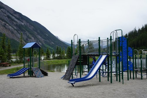 湖邊有兒童遊樂器材,小朋友邊吃邊玩很開心
