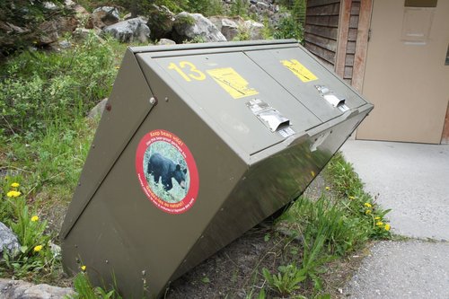 因為落磯山區常有熊出沒,熊常常會到垃圾桶翻找東西吃,所以設計了特別的開關,必須把手伸進開關裡用力推一下才可以打開垃圾桶,我想熊應該沒那麼聰明吧